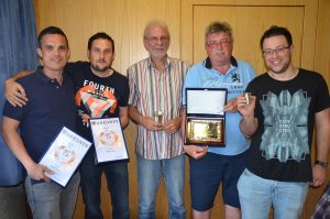 Ganz besonders schön dieses Jahr, gleich zweimal wurde dieses Mal die höchste Ehrung des Vereins vergeben. Für ihre herausragenden Verdienste um den Verein wurden Werner (Schnaggi) Schneider und Werner Prill (in Abwesenheit) zu neuen Ehrenmitgliedern ernannt. Für hundert Spiele für den Verein erhielt Bezirksmeister Matthias Sindlinger einen Pokal. Ebenso Kassierer Jo Witzke, für 250 Spiele, und last but not least Raphael Brenner und Sebastian Schurer für jeweils 15 Jahre Mitgliedschaft im Verein. Klasse Jungs!