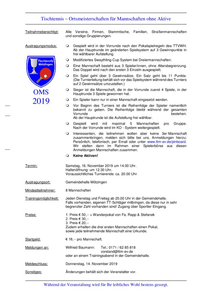 Die Ortsmeisterschaften 2019 finden am 15. November (Aktive) und am 16. November (Nichtaktive) in der Mötzinger Gemeindehalle statt. Wie gewohnt wird es bei den Nichtaktiven ein 3er-Mannschaftsturnier, Hallenöffnung 12:30 Uhr, Beginn 14:00 Uhr. Auch Interessenten, die keine 3er-Mannschaft zusammenbekommen sollten sich melden, wir stellen dann passende Mannschaften zusammen. Die Anmeldung erfolgt über unseren 1. Vorsitzenden Wilfried Baumann 0171/6285818. Anmeldeschluß ist am Donnerstag den 14. November.